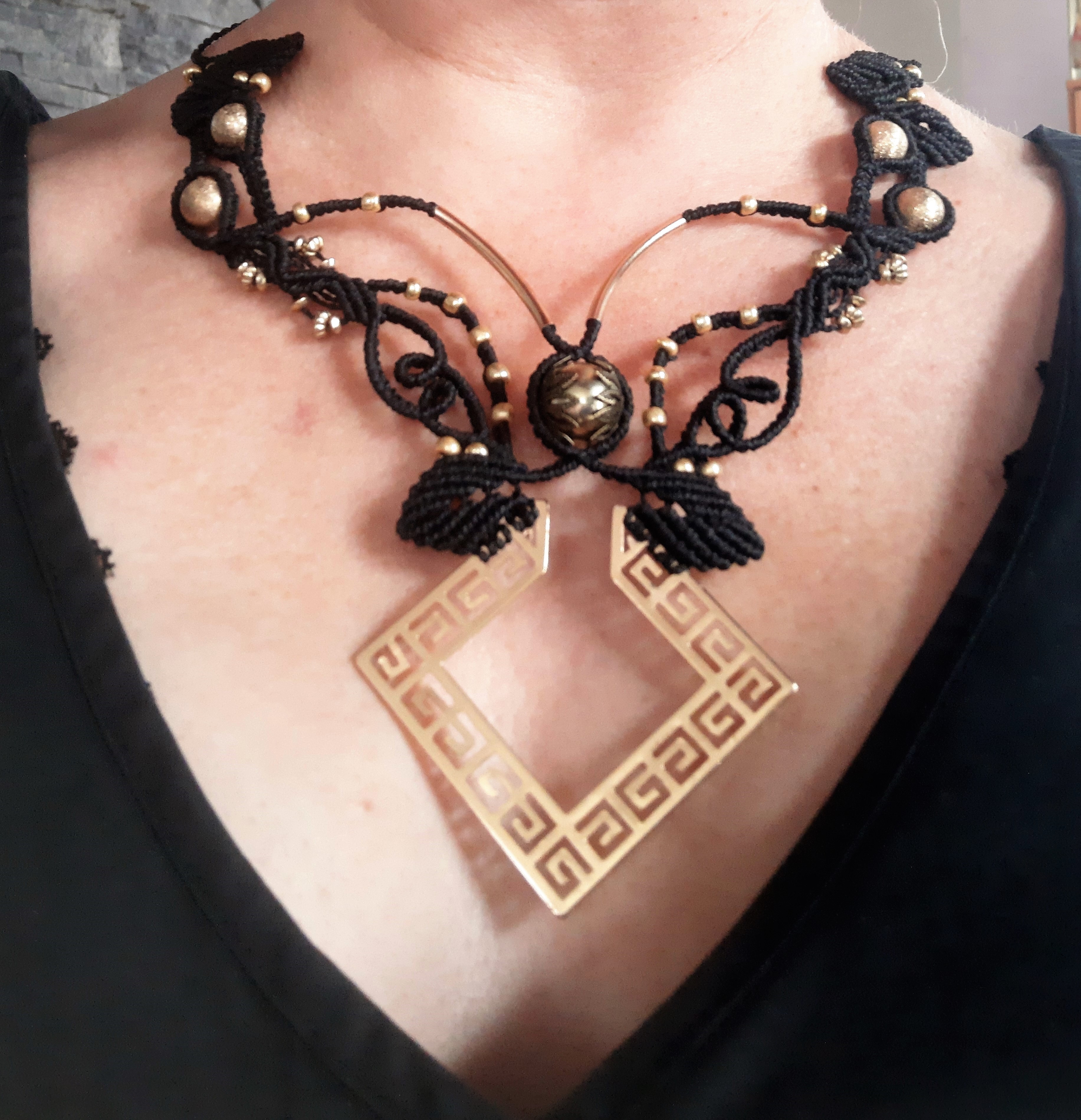 Fils de polyester cirés noir, perles fantaisies, médaillon fantaisie