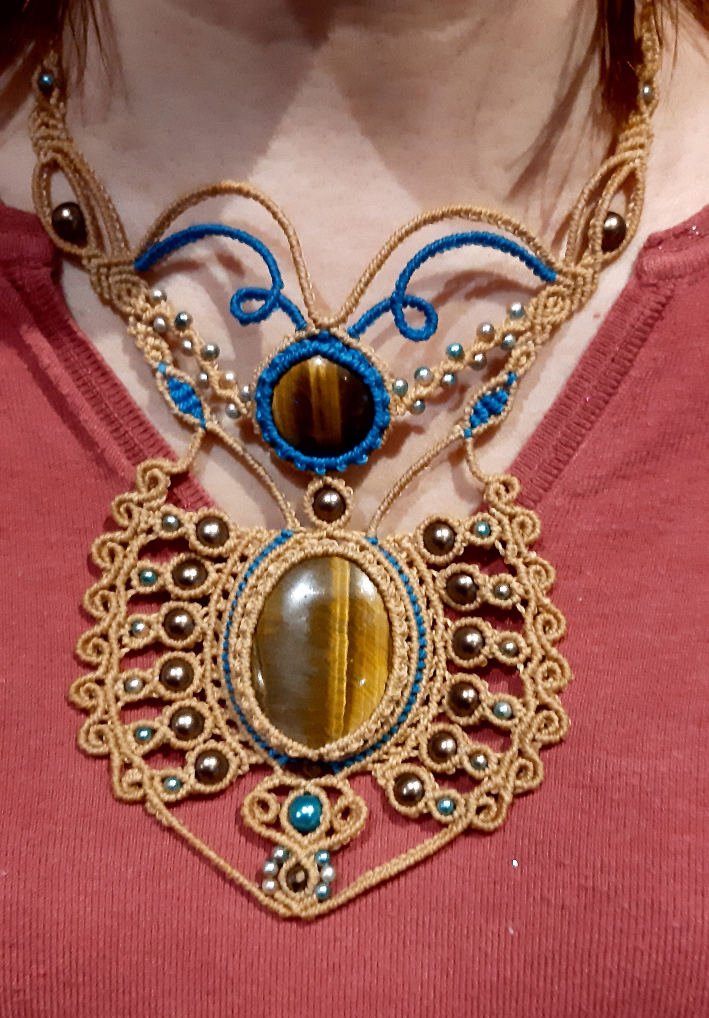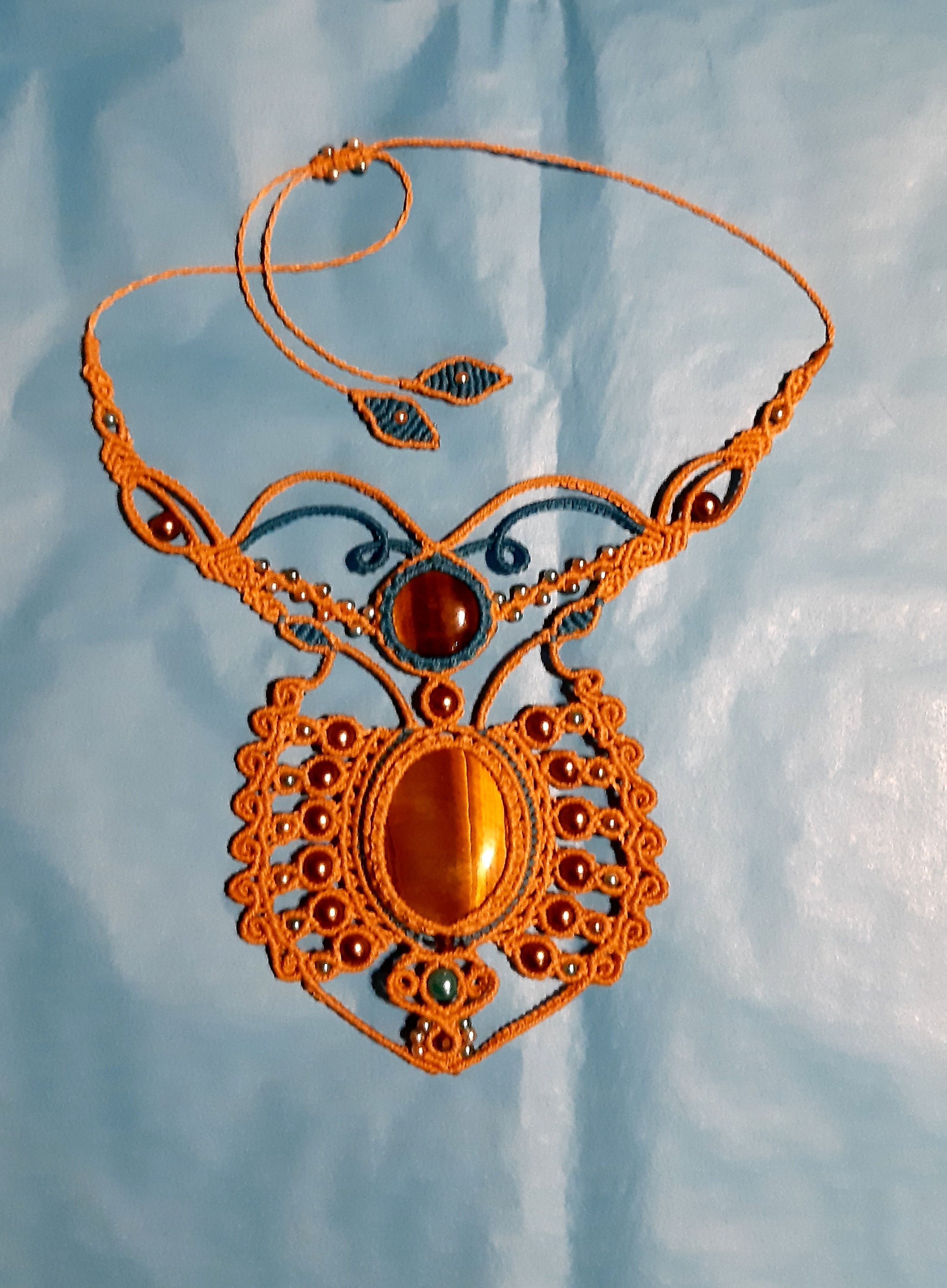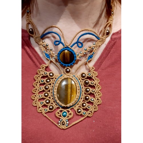 Fils alezan 314, bleu roi 707. Pierres œil de tigre.